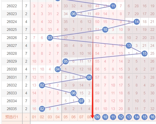 上图是福彩双色球蓝球开奖号码走势分布图,我标注出来的数字这个区域已经连续遗漏了7期,这个区域的数字有8个,那么本期的蓝球号码范围可以关注这个区域的数字,关注数字09 10 11 12 13 14 15 16出蓝球号码。