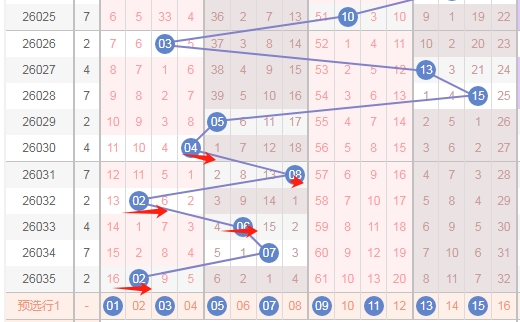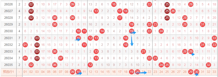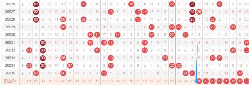 上图是福彩双色球红球开奖号码走势分布图,我标注出来的数字26 27 28 29 30 31 32 33这里数字有8个,上期这个区域出号码一个,最近2期这个区域出号码一个,那么本期这个区域的数字可以关注出2个或者3个吧,可以看看连号,比如2728 3132 3233。
