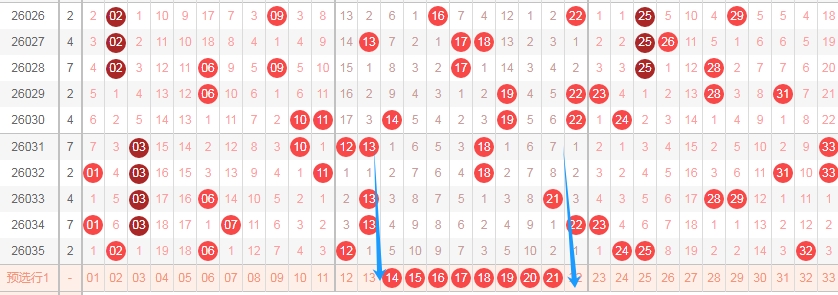 上图是福彩双色球红球开奖号码走势分布图,我标注出来的数字14 15 16 17 18 19 20 21这里数字有8个,最近这个区域已经连续遗漏了两期,最近这个区域出号码也不多,那么本期这个区域的数字可以关注出2个或者3个吧,可以看看连号,比如1415 1516 2021。