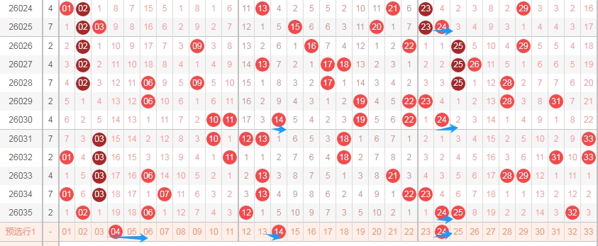 上图是福彩双色球红球开奖号码走势分布图,我标注出来的数字4尾数数字04 14 24上期开出了一个,最近十期内4尾数数字04 14 24出号码不多,那么本期可以继续看4尾数的数字04 14 24出一个或者两个。