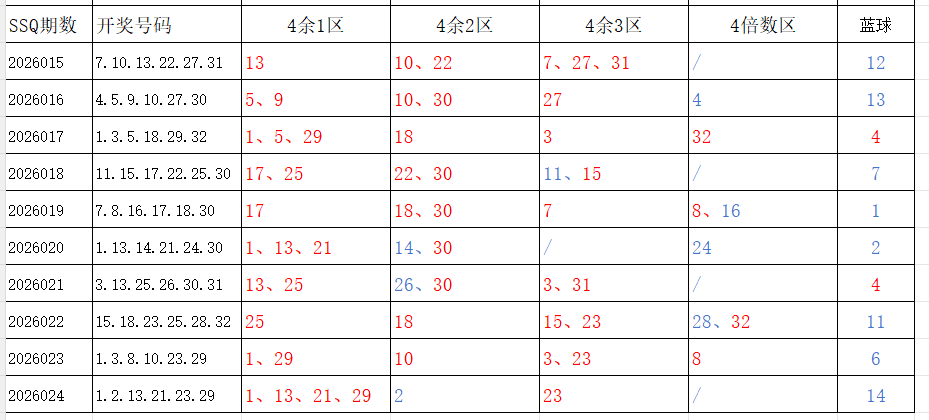 分享第一个数据分析:四分区统计数据。相对于传统的三分区,个人习惯使用四分区,就是把33个红球号码除以4,所得的余数分区如下: