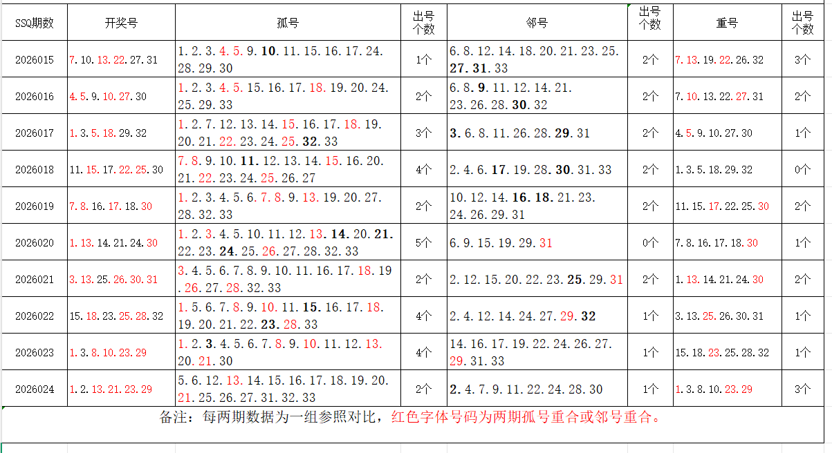 如图,以近两期数据为一组,进行对比分析。相同的孤号、邻号,可能在下期出1-4个左右。上期开出孤号2个,邻号1个,重号3个。本期参考孤号:4.5.6.7.8.9.10.11.15.16.17.18.19.25.26.27.31.32.33;邻号:3.12.14.20.22.24.28.30;孤、邻号重合号码精选:***(会员专区可见)。个人分析,仅供参考。