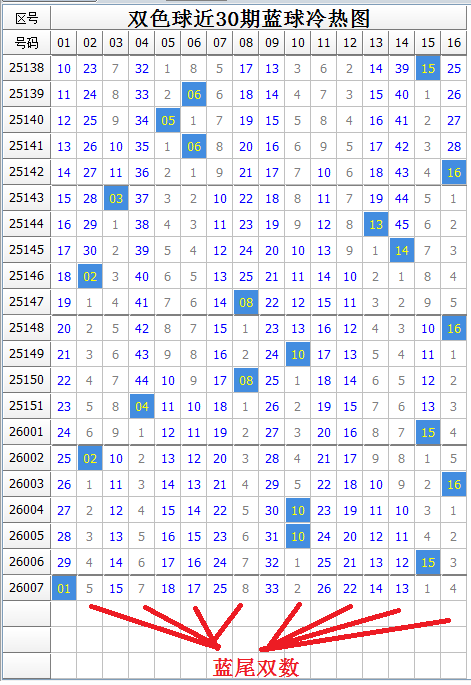 蓝球本期有热蓝7枚,冷蓝9枚,蓝球冷码数量稍多。上期开出冷蓝,由于近期蓝球冷热交替开出规律不明显,本期蓝球热码冷热难定。