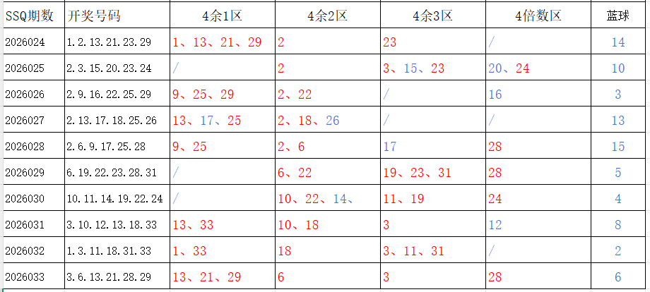 分享第一个数据分析:四分区统计数据。相对于传统的三分区,个人习惯使用四分区,就是把33个红球号码除以4,所得的余数分区如下: