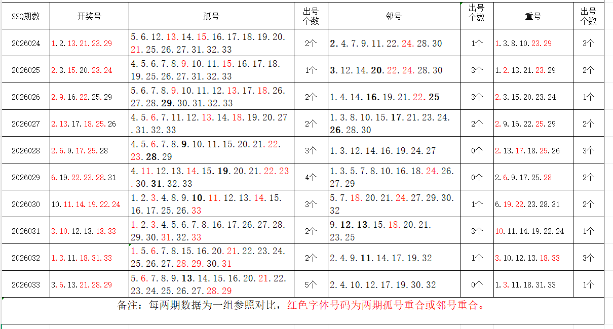 如图,以近两期数据为一组,进行对比分析。相同的孤号、邻号,可能在下期出1-4个左右。上期开出孤号5个,邻号0个,重号1个。本期参考孤号:1.8.9.10.11.15.16.17.18.19.23.24.25.26.31.32.33;邻号:2.4.5.7.12.14.20.22.27.30;孤、邻号重合号码精选:***(会员专区可见)。个人分析,仅供参考。