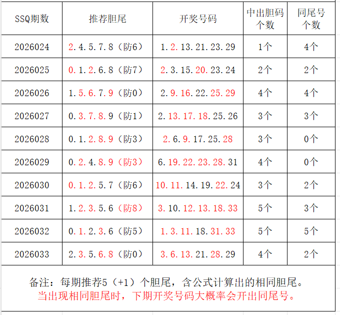 如图,每期推荐胆尾中出1-4个。上期推荐胆尾中出3尾4码!推荐胆尾是按照公式计算的顺序,不定位红球号码的顺序。本期推荐胆尾:7尾/9尾/1尾/2尾/3尾 。加推重点胆尾:***(会员专区可见)。推荐胆码号码:***(会员专区可见)。个人分析,仅供参考。