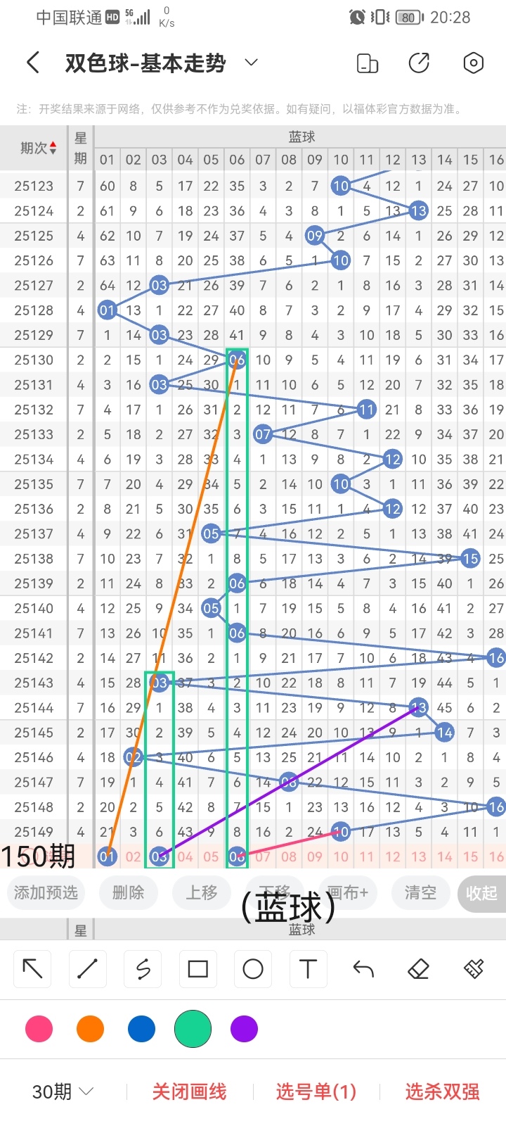 小梁根据上面图中画线思路及走势分析,最后给大家汇总提供一下本期红球、蓝球数据,供大家参考: