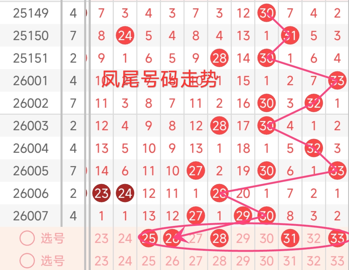 上期凤尾号码为30,振幅上升了2点,开出了偶数号码。回顾近期凤尾号码,振幅波动较大。上期凤尾为30,处于红三区的高位。红三区号码作为凤尾号码出现的频率较高。近期凤尾号码波动较大,本期凤尾号码可能会有所下降,但仍大概率在红三区。预计凤尾可能在26 - 33之间。本期还还需关注遗漏值较高的号码,有望在本期回补开出。本期凤尾号码可重点关注25、26、28、31、33。