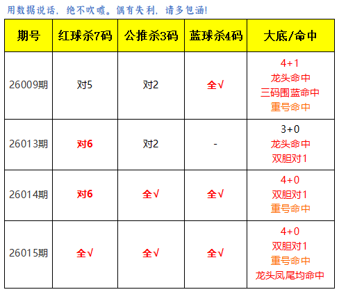 上期红球杀7码全对,公推杀3码全对,蓝球杀号全对。