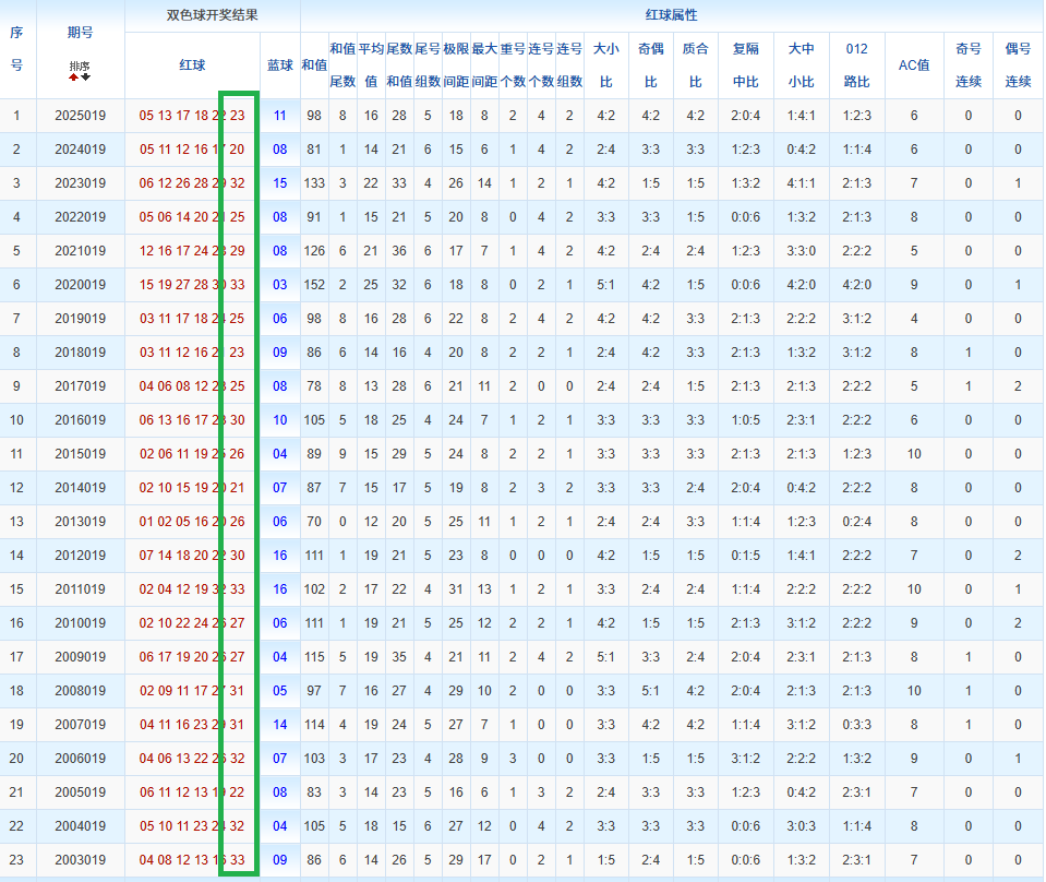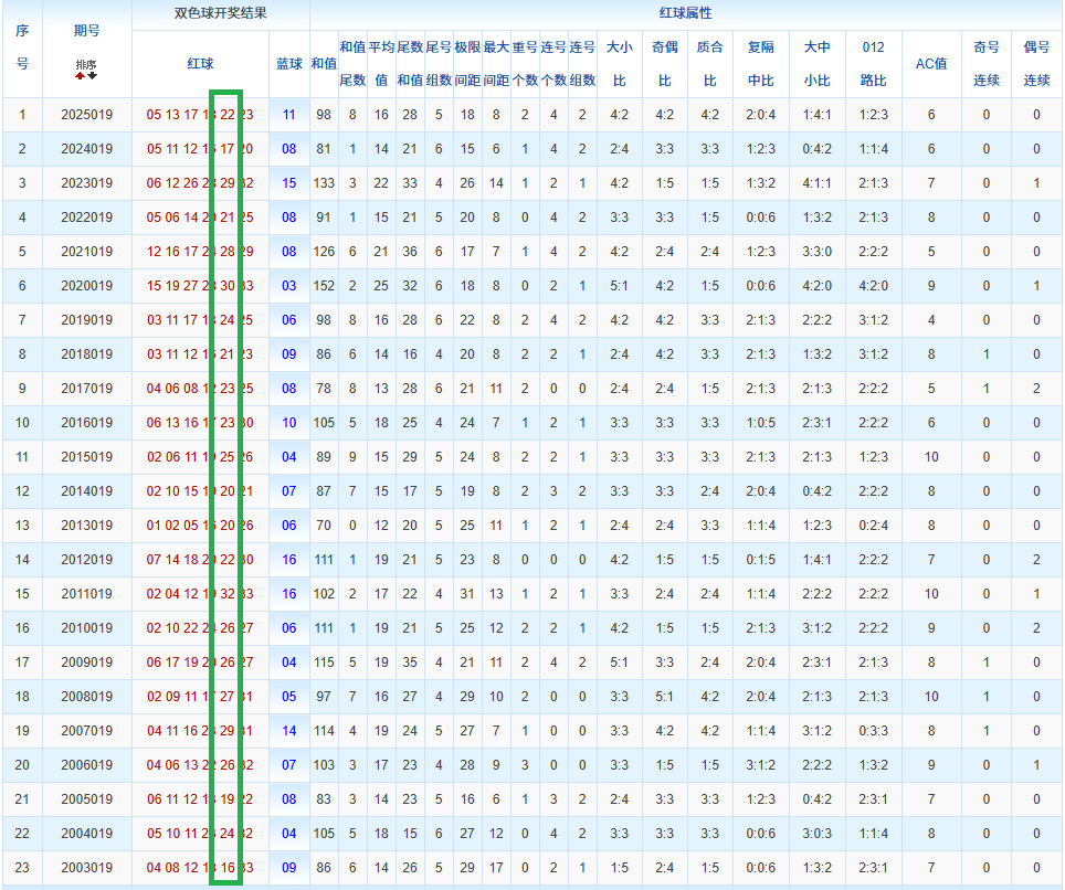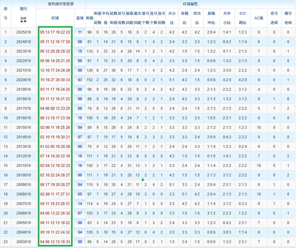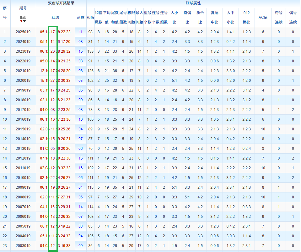 通过观察,我发现双色球往年同期的开奖数据与本期号码之间存在显著关联。具体来说,在红球中,从第一位至第六位,通常会有约4个位置上的数字与往年同期相同位置的号码一致;而蓝球号码中,也有多期开奖结果直接包含了往年同期的数字。因此,我们可以借助往年同期各位置上的号码,作为分析本期开奖情况的重要依据。在此基础上,还可结合往年同期的其他相关条件,进行综合性的号码组合推荐。