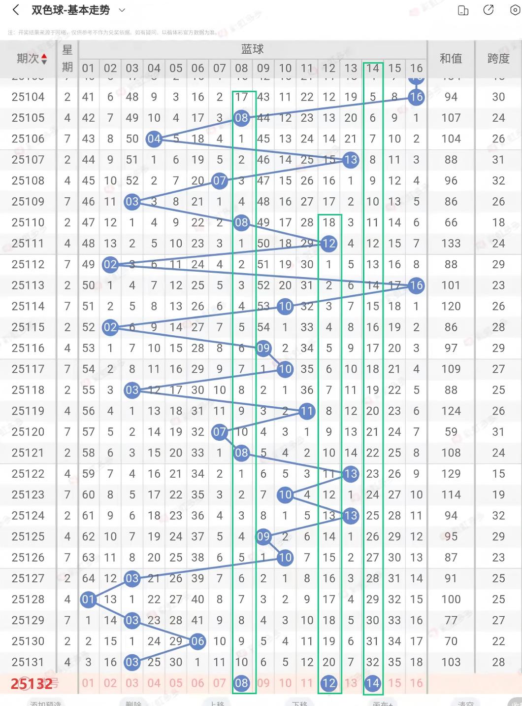 上期蓝球03,奇数、质数、012路为0路,重开机率不大,不过各人的看法而落号,按照奇偶排列走势和质合排列走势本期综合看好偶合数,012路看好2路防0路。小号可参考08,如大号可参考12、14。本期推蓝球号码可参考08、12、14