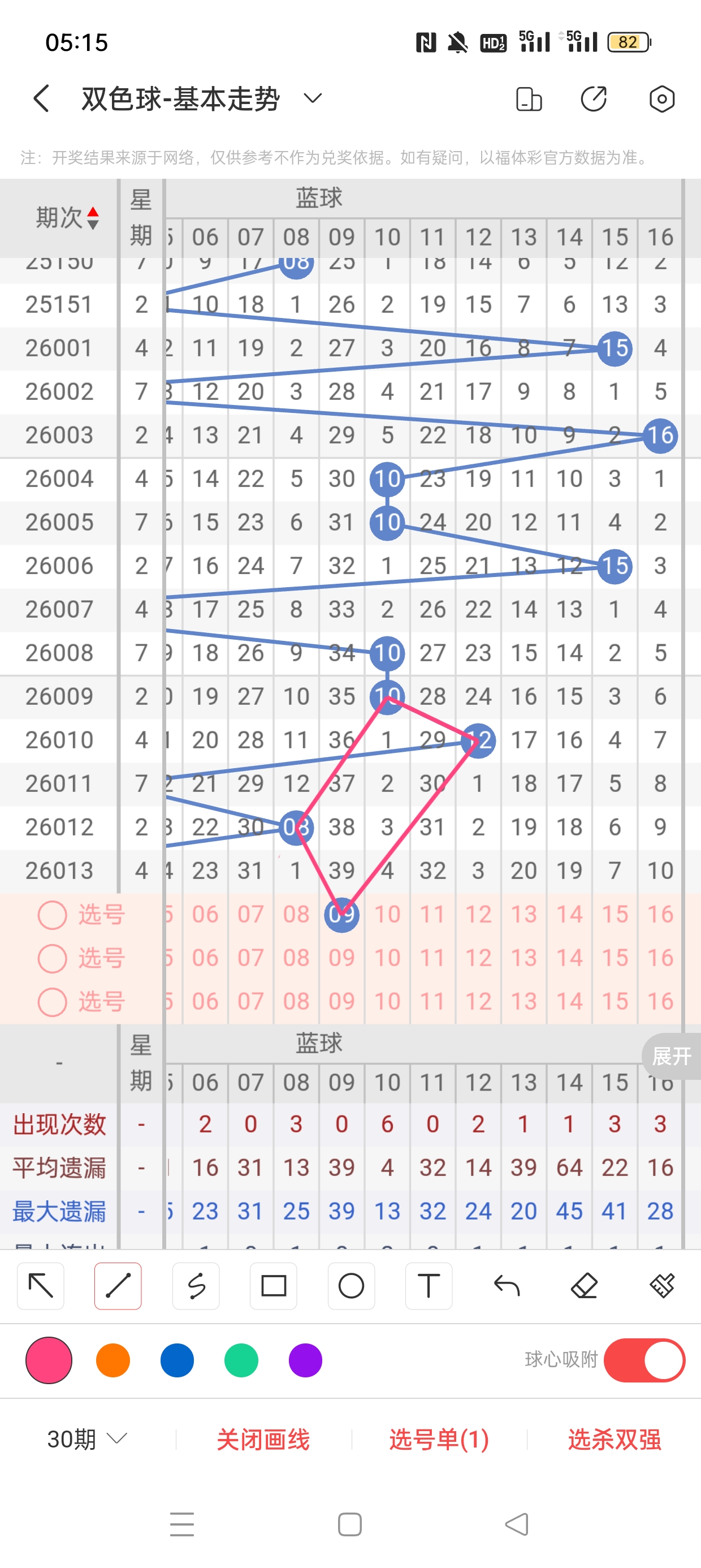 后区(1-16)近18期本区012路2:2:14,2路热度高,本期着重0/1路。9已遗漏39期,与8之间呈现向右遗漏递减态势,需防。