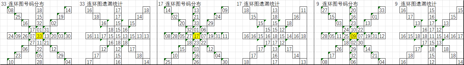 由于数据量大,不一一统计,下图为各个号码分别在33、17、9连环图上的遗漏统计汇总图: