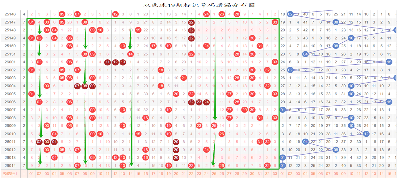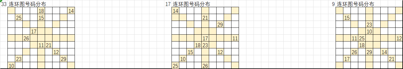 以上是遗漏大于16的号码分别在33、17、9连环图的分布,按照九转连环图选号规律,选取这些号码“环上”和“轴上”的相邻号码作为胆码,把这些胆码进行次数统计即可形成我们组号的排序,从出次多到少进行取号得出我们的大底。