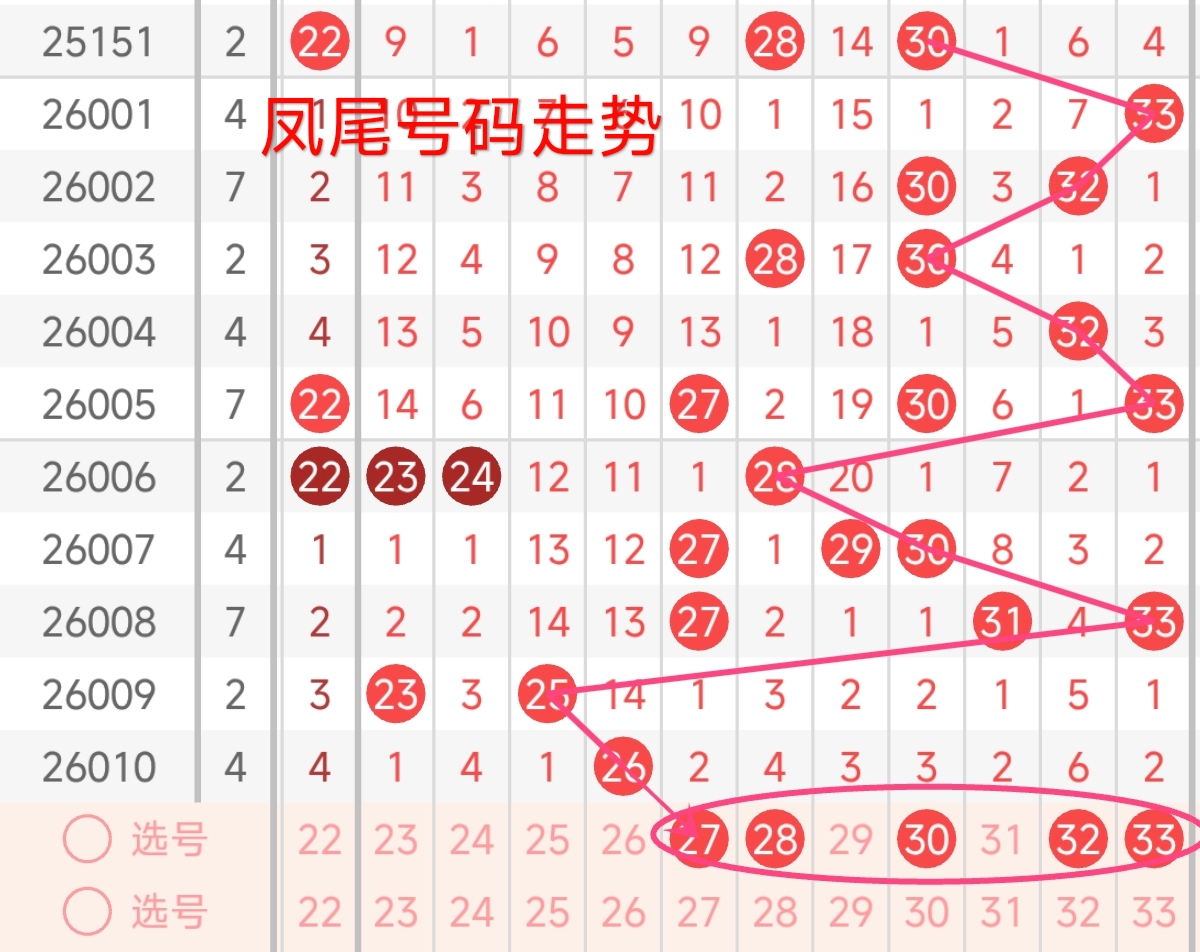 红球三区推荐(23~33):  上期开出1枚号码,号码为26,本期红三区建议出号1-3枚,本期红三区建议出关注号27、28、30、32、33。