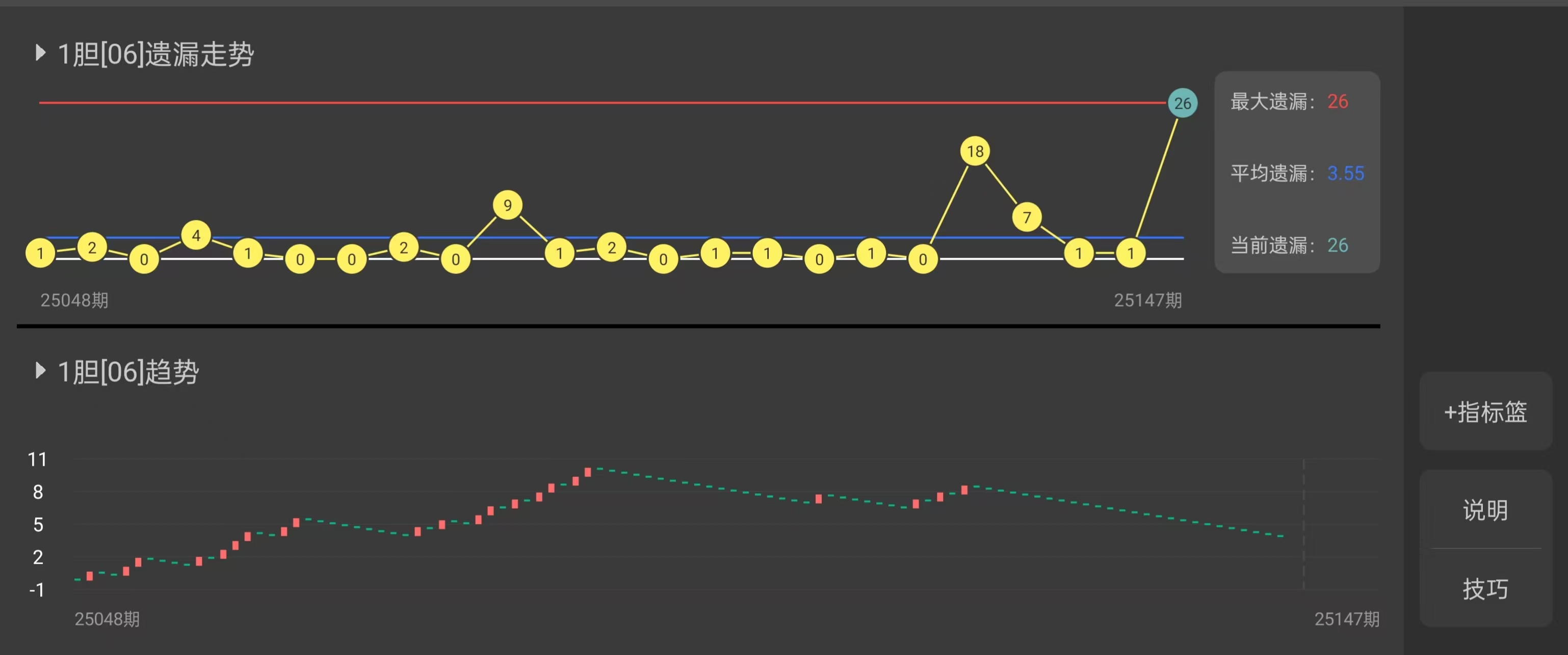 总平均数(8.45)高于中位数(6),同样显示蓝球分布右偏,较大数字(如13、14、15、16)拉高了平均值。中位数06表明有一半的蓝球数字小于或等于06,而平均数高于中位数,说明近期蓝球中较大数字的出现频率不低。从范围看,蓝球数字覆盖了02至16,但01、04、07、09、10、11、12等数字未出现