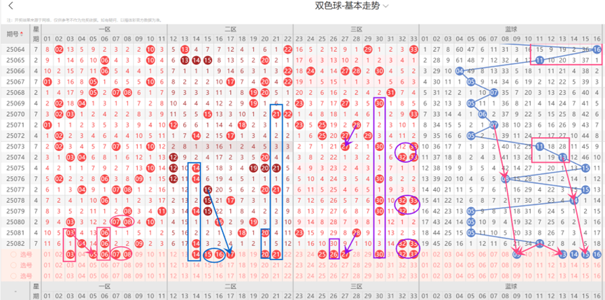 上一期三区开出了2个号码;本期三区断区的可能性低,本期三区出号数量可以考虑1-2个;本期三区需要关注的号码:26遗漏值较高,近期可能出号;26-27可能会一起落号;30容易在遗漏值2或3时出号;32-33可能会有号码重开;因此本期三区选号应该考虑26-27-30-32-33等号码。