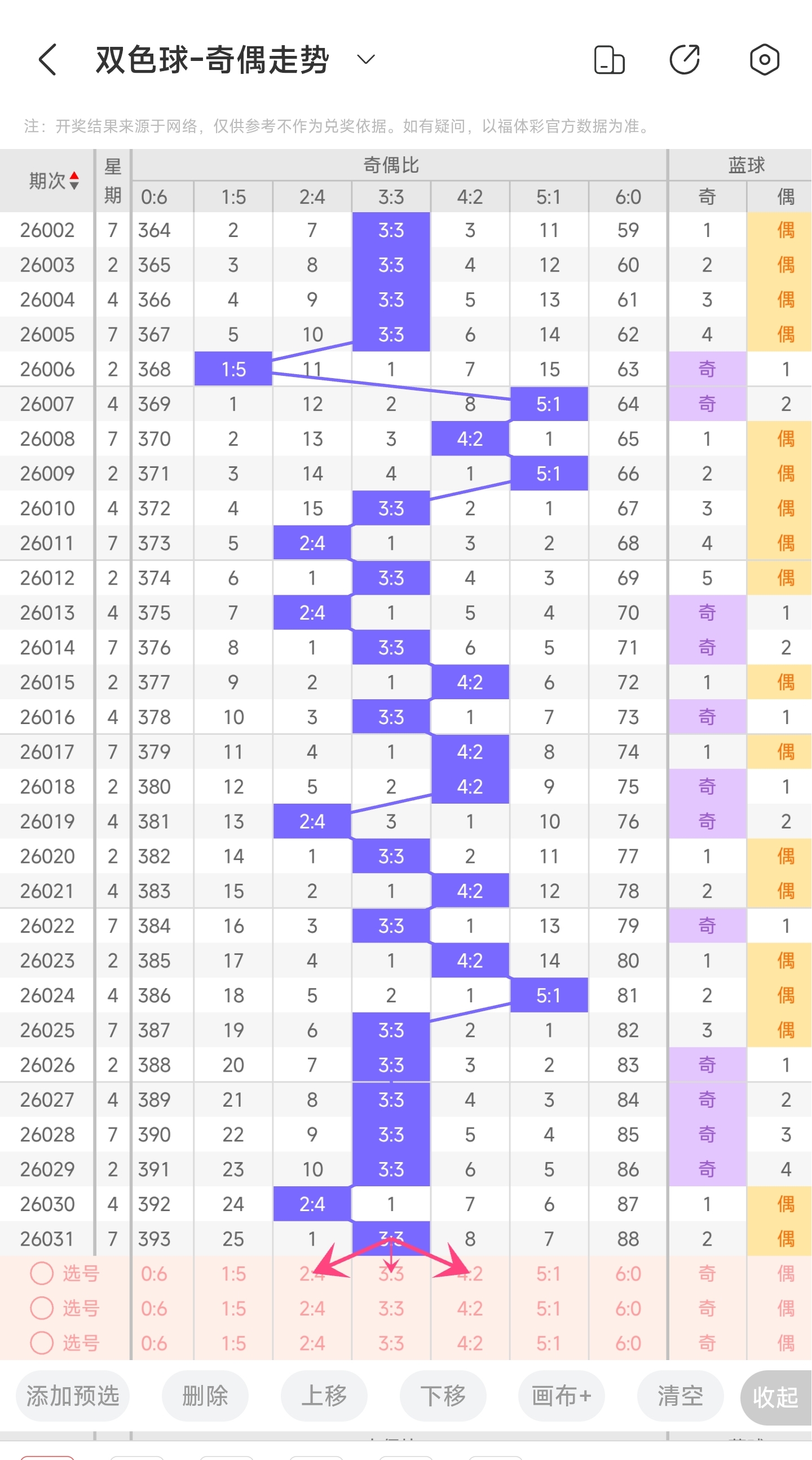 上期奇偶比为3:3,分别为奇偶偶奇偶奇。往前一期奇偶比为2:4。通过近30期内奇偶走势的数据分析,目前1:5奇偶比开出的概率是3.33%,5:1奇偶比开出的概率是10%,3:3奇偶比开出的概率是53.33%,4:2奇偶比开出的概率是20%,2:4奇偶比开出的概率是13.33%,6:0奇偶比开出的概率是0%。与前一期相比,概率没有发生变化。通过分析走势图,上期开了3:3奇偶比,本期有可能开4:2或者3:3奇偶比,其次是2:4奇偶比。所以本期推测本期可能开4:2奇偶比和3:3奇偶比,其次是2:4,最后是1:5和5:1奇偶比。