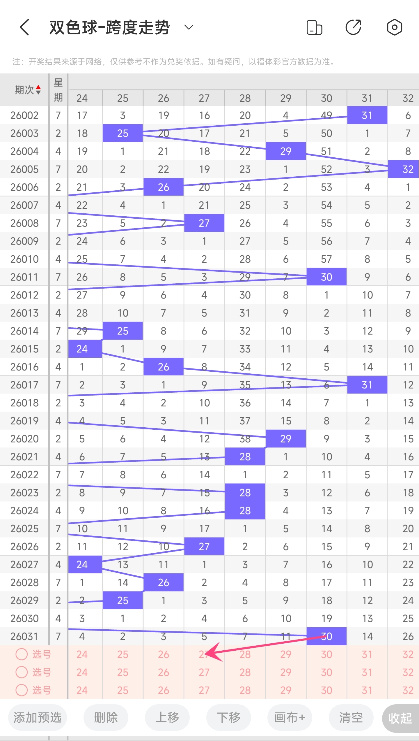 上期龙头为3,凤尾为33,跨度为30,往前一期跨度是14,偏移量为16。30跨度值是30期内开出很大的跨度值。下降的空间比较大,上升空间很小,再根据最近龙头凤尾走势,本期跨度可能会变小,所以推测本期跨度趋势是往左的,跨度变小,小概率往右,跨度变大。