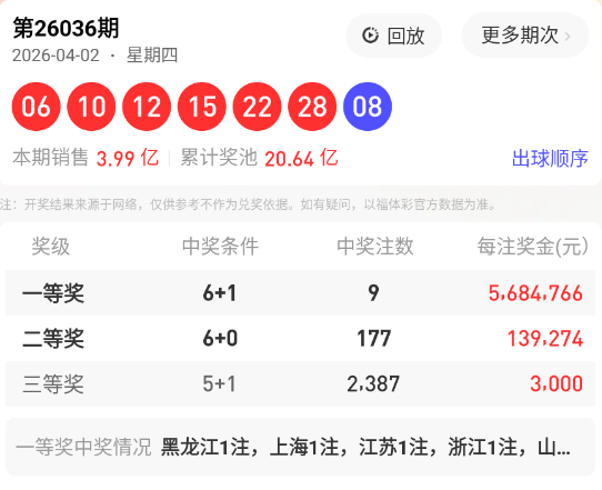上期回顾:双色球036期开出红球号码为: