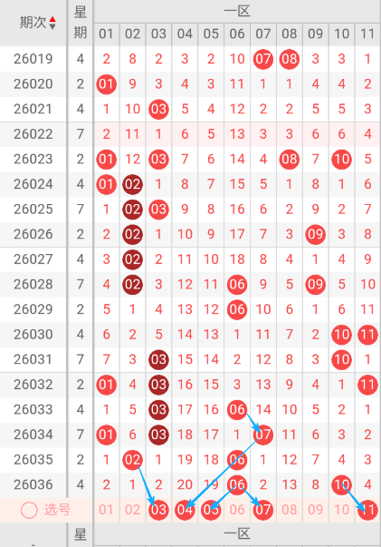 根据走势图可以看出当区段,025期开出个02.03二号码球 ,026期开出02.09二个号码球 ,027期开出02一个号码球 ,028期开出02.06.09三个号码球 ,029期开出06一个号码球 ,030期开出10.11二个号码球 ,031期开出03.10个号码球 ,033期开出03.06二个号码球 ,034期开出01.03.07三个号码球 ,036期开出06.10二个号码球 ,按照如此规律本期当前区判断可能会开出1双或1单1双。我们看下当前区上期开出06重叠号,那么本期当前区要定重叠号的情况下可关注10号码球。再看下当前区段上期没有开斜连号,当期选号得留意07斜连号。建议重点关注03.04.05.07.11