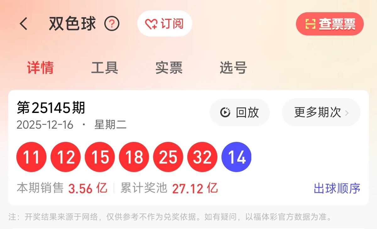 首先让我们回顾一下上期双色球25145期的开奖号码为11、12、15、18、25、32,蓝球14。和值113,跨度21,区间比为1:3:2,奇偶比为3:3。