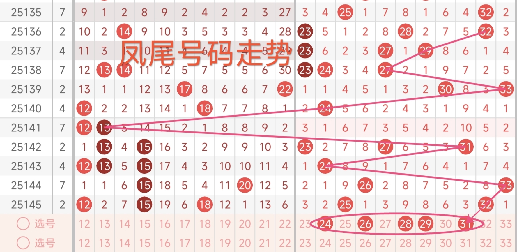 红球三区推荐(23~33): 上期开出2枚号码,号码为25、32,本期红三区建议出号1-3枚,本期红三区建议出关注号24、26、28、29、31。