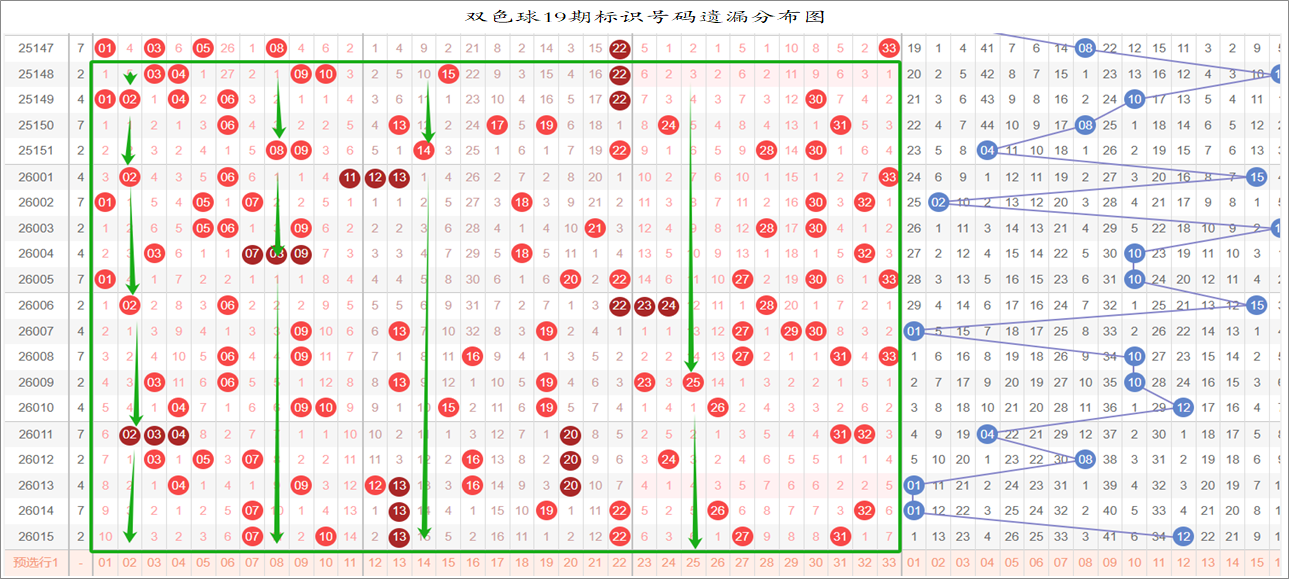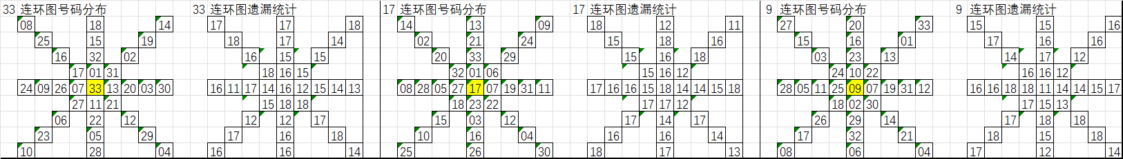 由于数据量大,不一一统计,下图为各个号码分别在33、17、9连环图上的遗漏统计汇总图: