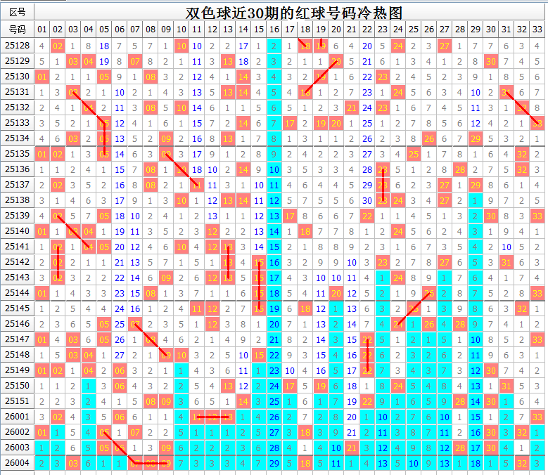 双色球近30期的红球号码冷热图 (数字为遗漏期数,蓝色标记的为遗漏超过10期的大冷号)