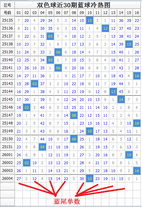 蓝球本期有热蓝6枚,冷蓝10枚,蓝球冷码数量稍多。上期开出热蓝,这是连续三期开出,由于近期蓝球冷热交替开出规律不明显,本期蓝球热码冷热难定。