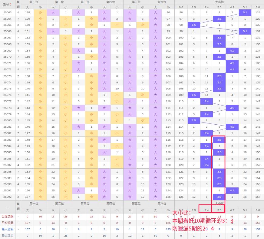 上期大小比:3:3,近10期大小比出现情况:3:3、2:4、3:3、2:4、2:4、3:3、3:3、3:3、4:2、3:3,最近10期出现5期3:3,出现2期4:2,出3期2:4,出现0期5:1,出现0期1:5,出现0期6:0,出现0期0:6,根据近10期规律本期看好10期循环出3:3,防遗漏5期的2:4,综上所述推荐大小比推荐:2:4,重点关注:3:3。