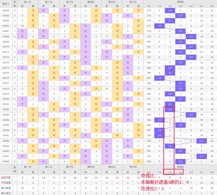 上期奇偶比:3:3,近10期奇偶比出现情况:4:2、1:5、3:3、1:5、1:5、5:1、2:4、3:3、5:1、3:3,最近10期出现4期3:3,出现1期4:2,出现1期2:4,出现2期5:1,出现3期1:5,出现0期6:0,出现0期0:6,根据近10期规律本期看好遗漏3期的2:4,防连出3:3,综上所述推荐奇偶比推荐:3:3,重点关注:2:4。