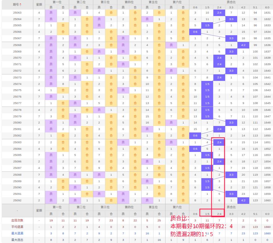 上期质合比:4:2,近10期质合比出现情况:2:4、0:6、1:5、2:4、1:5、3:3、1:5、1:5、3:3、4:2,最近10期出2期3:3,出现1期4:2,出现2期2:4,出现0期5:1,出现4期1:5,出现0期6:0,出现1期0:6,根据近10期规律本期看好10期循环的2:4,防遗漏2期的1:5,综上所述推荐质合比推荐:1:5,重点关注:2:4。