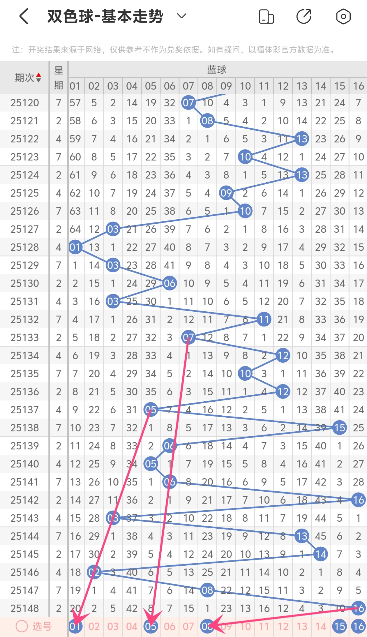 上期蓝球开出16,本期我们可以从上面走势图中看到选号的思路,01为斜连走势,05为斜连走势,08隔期回补走势,15为分边走势,16为重码,综合以上分析本期蓝球推荐01 05 08 15 16