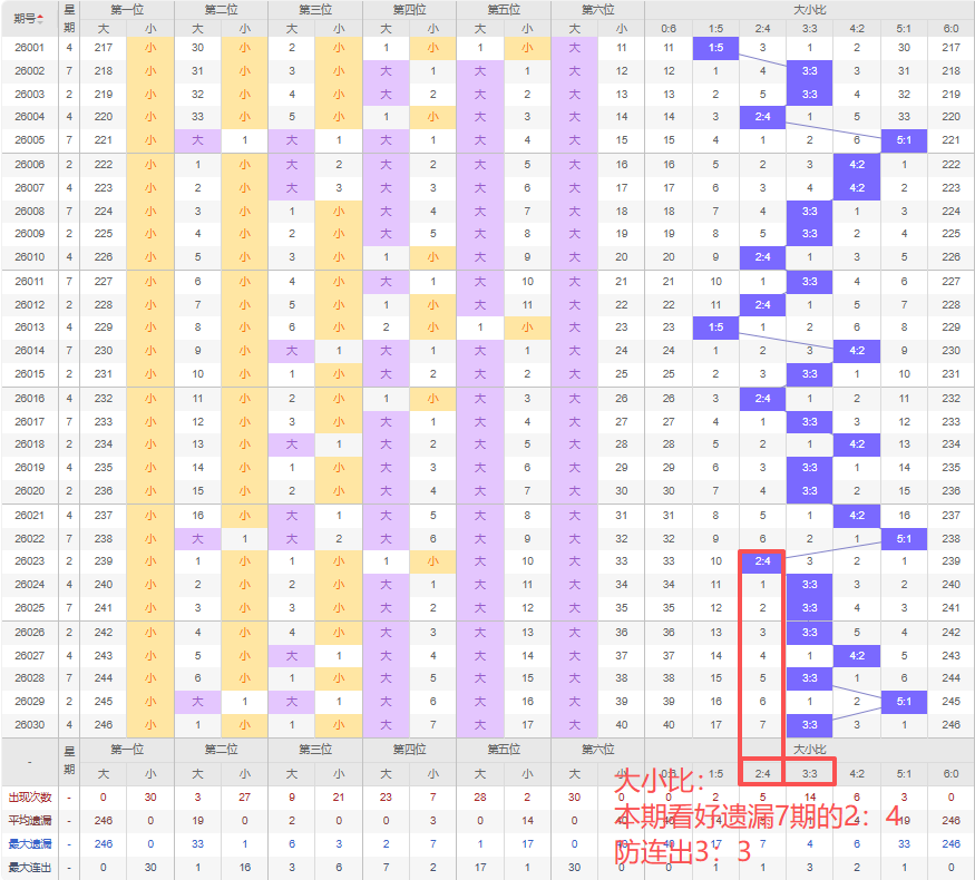 上期大小比:3:3,近10期大小比出现情况:4:2、5:1、2:4、3:3、3:3、3:3、4:2、3:3、5:1、3:3,最近10期出现5期3:3,出现2期4:2,出1期2:4,出现2期5:1,出现0期1:5,出现0期6:0,出现0期0:6,根据近10期规律本期看好遗漏7期开出2:4,防连出3:3,综上所述推荐大小比推荐:3:3,重点关注:2:4。