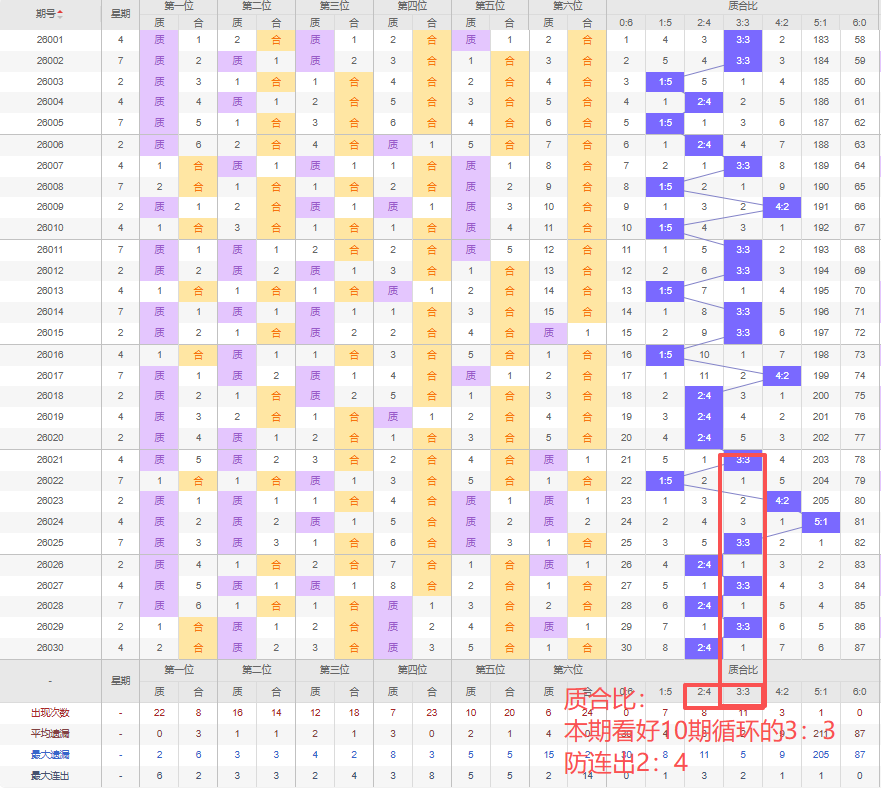 上期质合比:2:4,近10期质合比出现情况:3:3、1:5、4:2、5:1、3:3、2:4、3:3、2:4、3:3、2:4,最近10期出4期3:3,出现1期4:2,出现3期2:4,出现1期5:1,出现1期1:5,出现0期6:0,出现0期0:6,根据近10期规律本期看好10期循环的3:3,防连出2:4,综上所述推荐质合比推荐:2:4,重点关注:3:3。