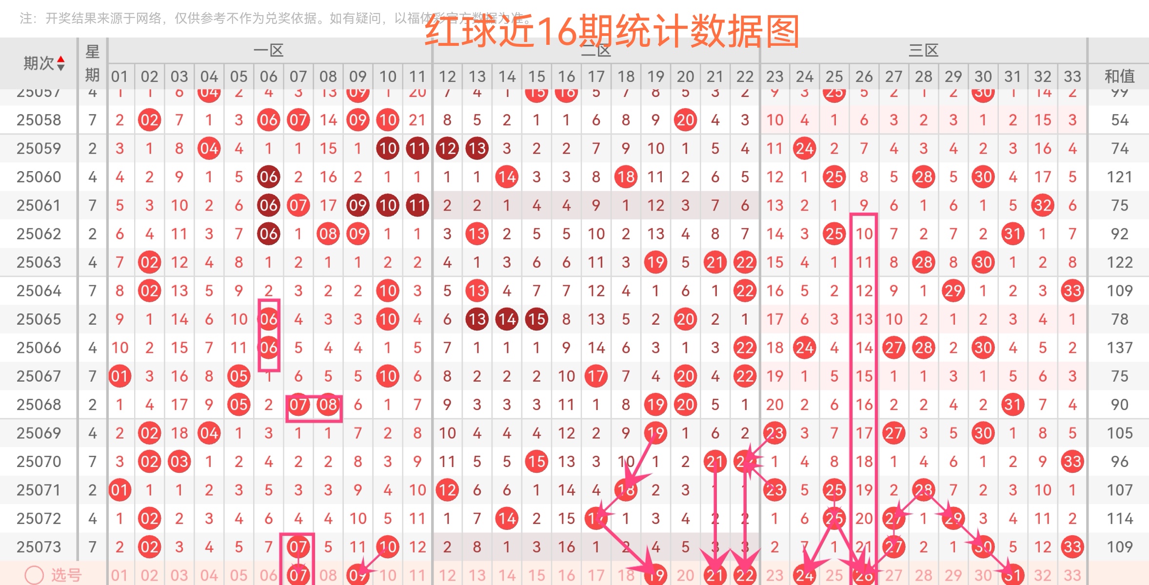 连号预警:近4期未现连号,中段(14-22)或大数区(27-33)可能爆发连号,如21-22或30-31。