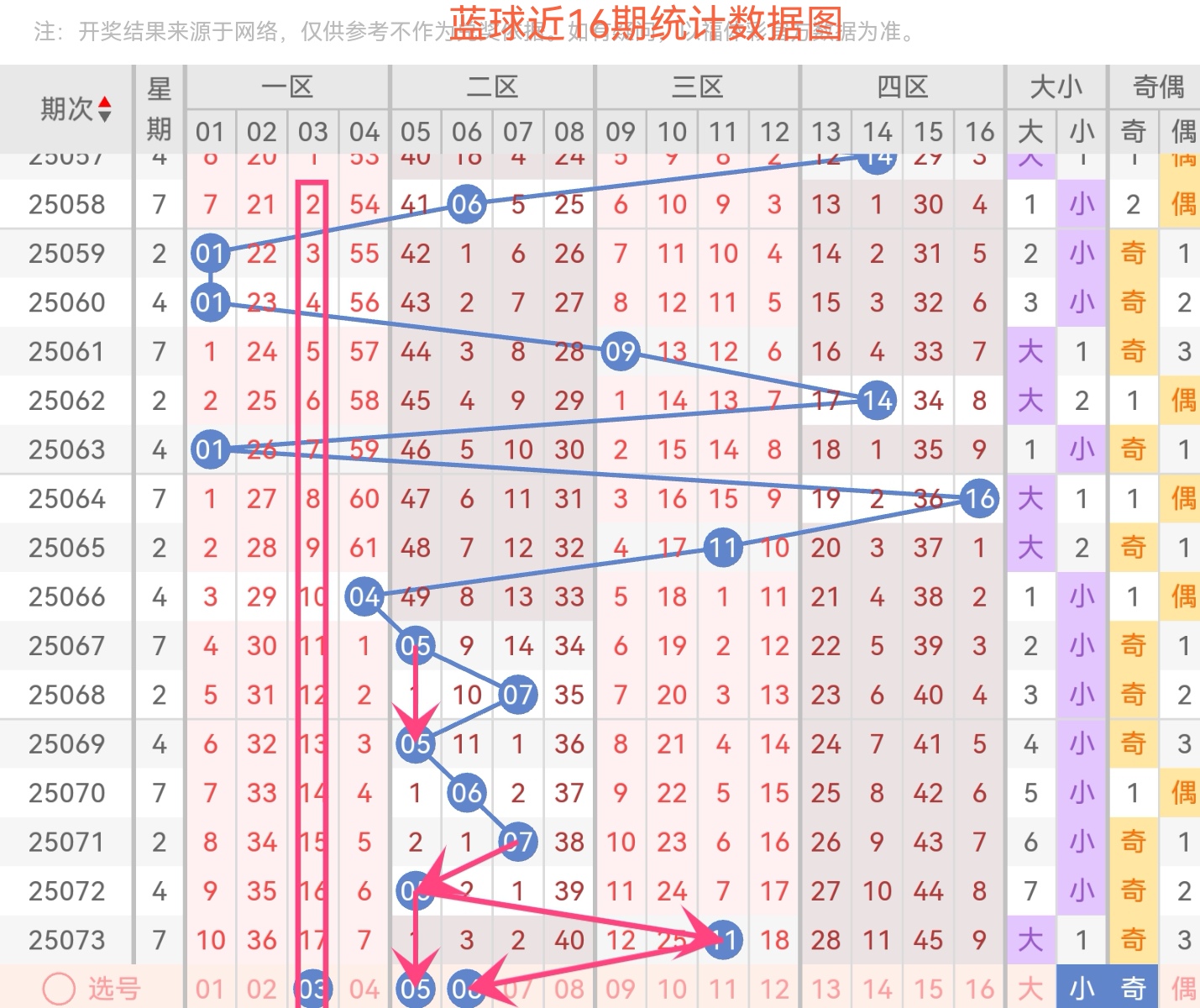 奇偶倾向:蓝球11(奇)后,近10期奇偶比7:3,奇数明显占优。预计本期偶数回补,推荐04、12、16。