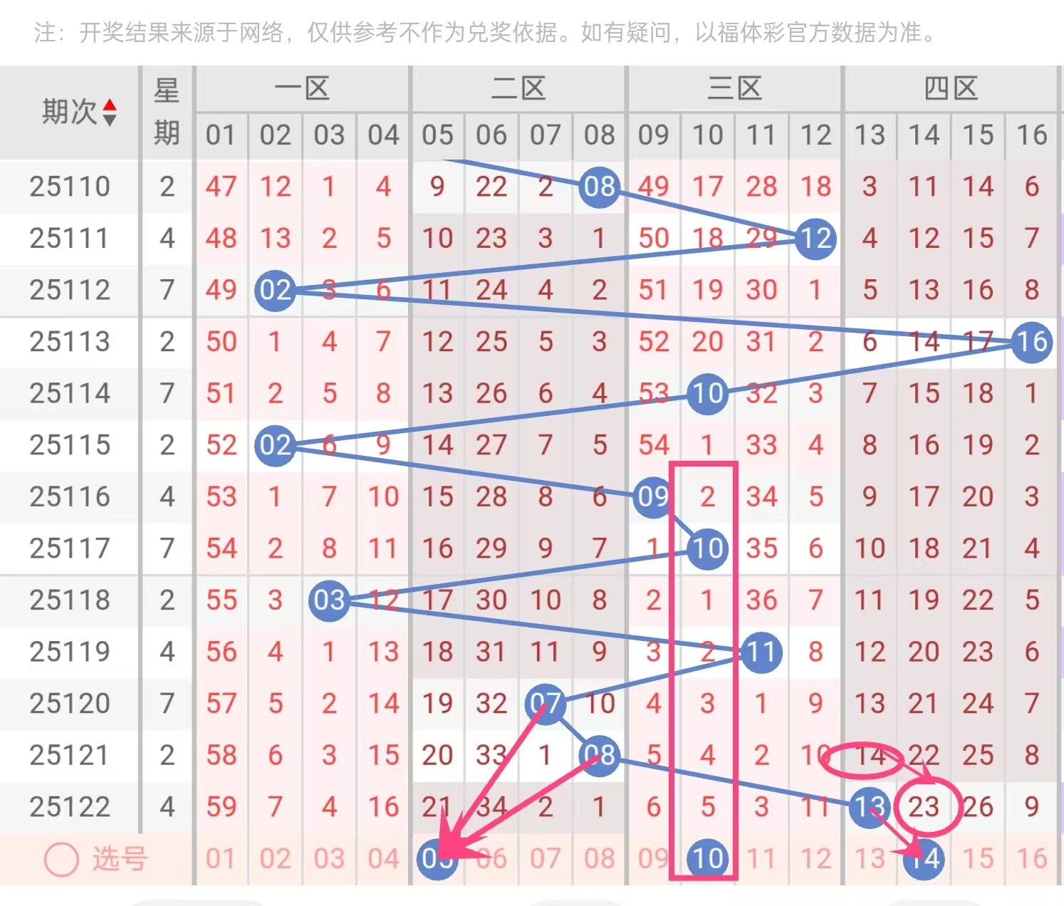 22号球:中后区过渡号码22近期出现明显的"失联"状态。其作为二区与三区的重要连接点,未能有效传递热度。从开奖分布看,20-23区间整体表现平淡,热点明显向18-20和24-26两个方向聚集,22号处于相对尴尬的位置。历史数据显示,此类过渡号码一旦陷入冷态,通常需要较长时间恢复。