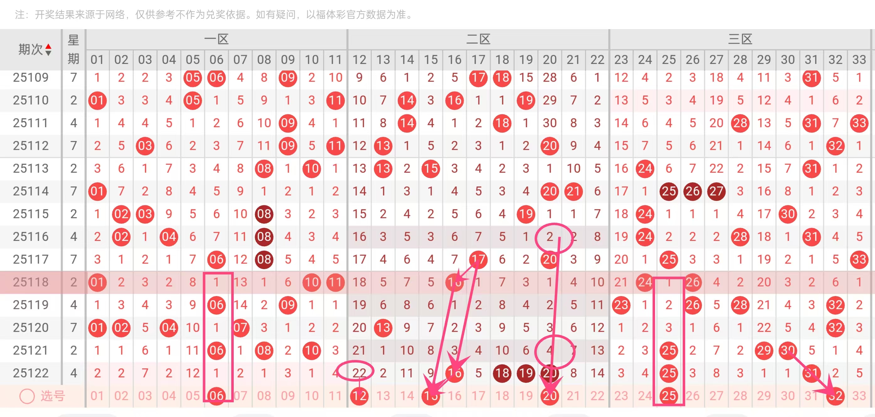 33号球:最大号码33正处于深度回调阶段。与相邻的31、32号相比,33号的表现明显弱势。从最大号区间的轮动规律观察,热点已经转移至30-32区间,33号需要更长时间进行能量积累。其历史出现频率本就相对平缓,在当前周期内更显弱势。