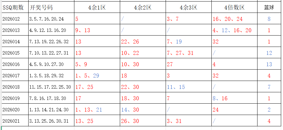首先看上期回顾,双色球2026021期开奖结果:3.13.25.26.30.31+4。其中红球号码开出:4余1区号2个,4余2区号码2个,4余3区号码2个,4倍数区号码0个。蓝球号码:冷号重开。再看上期个人分析:胆尾中出3尾4码!蓝球杀号全中!【会员专区】:冷热大底号码中4个,优选方案中4+0!恭喜中出的虹友!