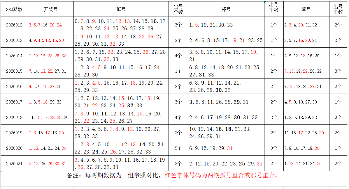 如图,以近两期数据为一组,进行对比分析。相同的孤号、邻号,可能在下期出1-4个左右。上期开出孤号2个,邻号2个,重号2个。本期参考孤号:1.5.6.7.8.9.10.11.15.16.17.18.19.20.21.22.23.28.33;邻号:2.4.12.14.24.27.29.32;孤、邻号重合号码精选:***(会员专区可见)。个人分析,仅供参考。