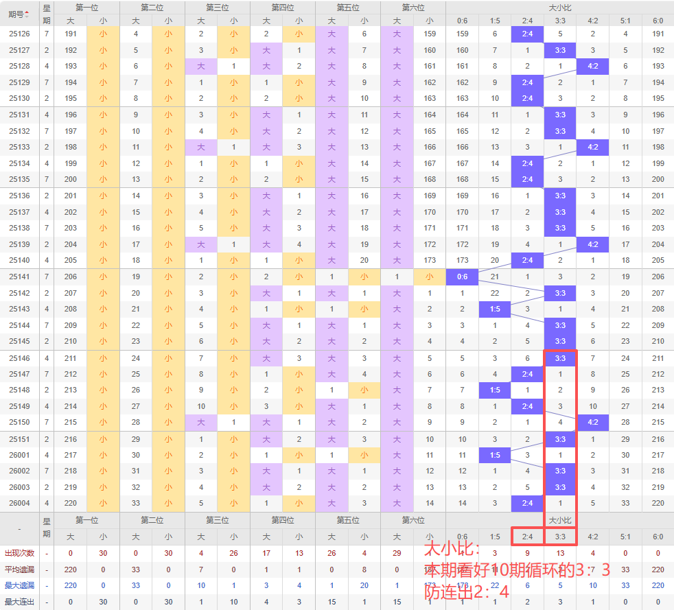 上期大小比:2:4,近10期大小比出现情况:3:3、2:4、1:5、2:4、4:2、3:3、1:5、3:3、3:3、2:4,最近10期出现4期3:3,出现1期4:2,出3期2:4,出现0期5:1,出现2期1:5,出现0期6:0,出现0期0:6,根据近10期规律本期看好10期循环的3:3,防连出2:4,综上所述推荐大小比推荐:2:4,重点关注:3:3。