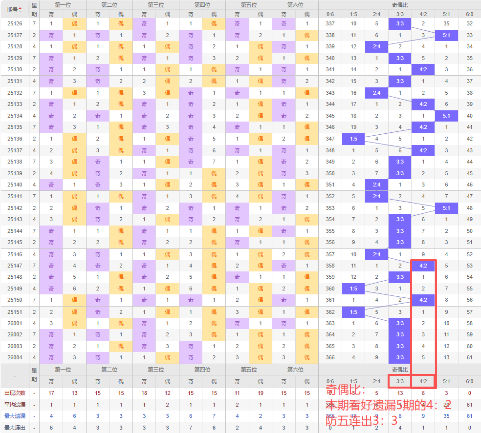 上期奇偶比:3:3,近10期奇偶比出现情况:2:4、4:2、3:3、1:5、4:2、1:5、3:3、3:3、3:3、3:3,最近10期出现5期3:3,出现2期4:2,出现1期2:4,出现0期5:1,出现2期1:5,出现0期6:0,出现0期0:6,根据近10期规律本期看好遗漏5期出4:2,防五连出3:3,综上所述推荐奇偶比推荐:3:3,重点关注:4:2。