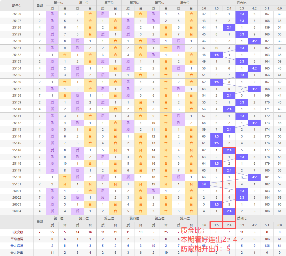 上期质合比:2:4,近10期质合比出现情况:2:4、3:3、1:5、2:4、4:2、0:6、3:3、3:3、1:5、2:4,最近10期出3期3:3,出现1期4:2,出现3期2:4,出现0期5:1,出现2期1:5,出现0期6:0,出现1期0:6,根据近10期规律本期看好连出2:4,防隔期开出1:5,综上所述推荐质合比推荐:1:5,重点关注:2:4。