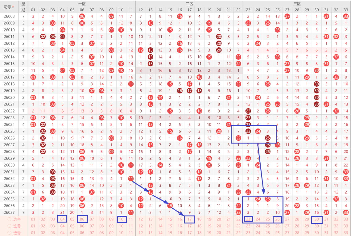 根据之前开出这种对称形态的情况,对于第三区间首先想到的就是23.26组合,数字30仅做个考虑为主吧,因为也是个大冷号,这种遗漏十几期以上的还是不太敢多选。