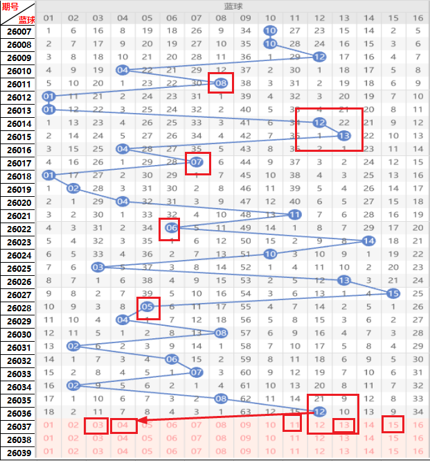 对于本期蓝球,通过走势来看的画还是有点意思的。首先我考虑的是之前蓝球12的走势情况,标记出来蓝球13,然后根据整体的结果走势和分析,重点关注奇数号的开出可能。其次就是画线出来03或者04的可能性,这个蓝球4,通过整体画线来讲很不错的。