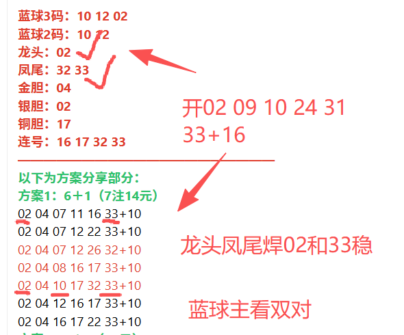 先回顾上期开奖号码:02 09 10 24 31+16。上期龙头凤尾焊02和33对等