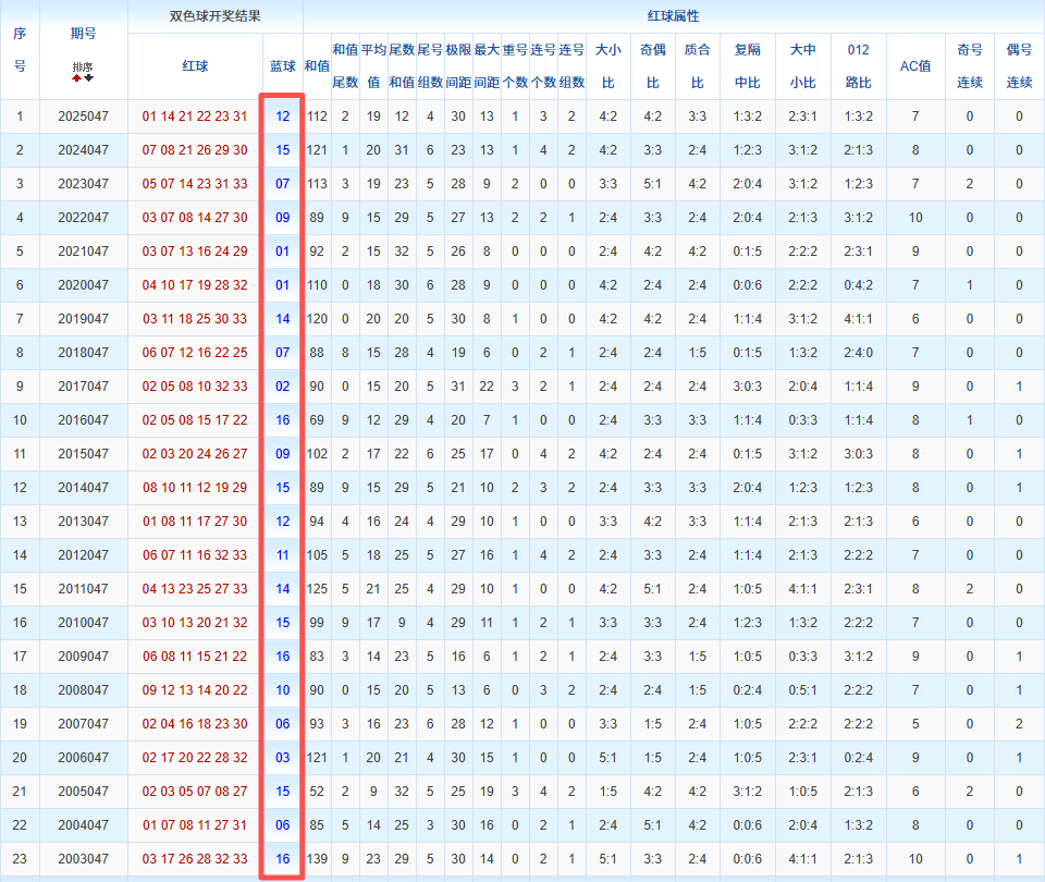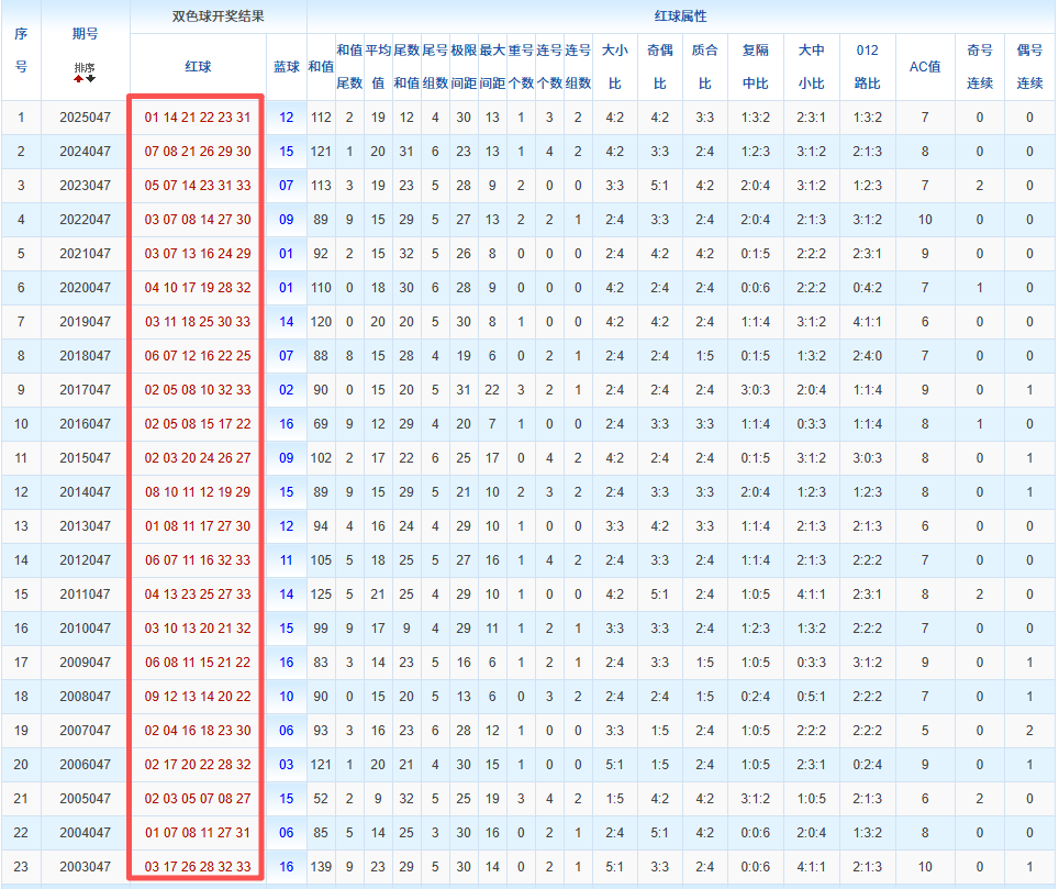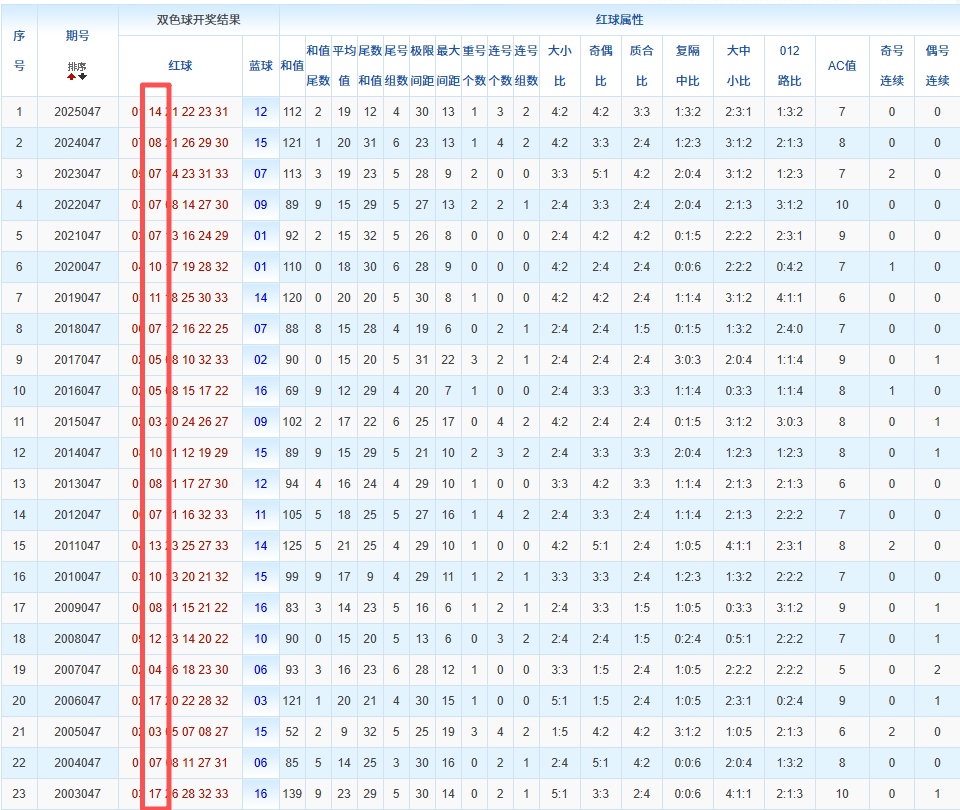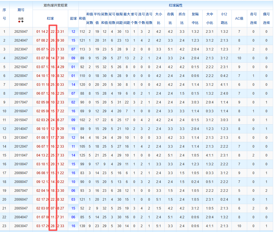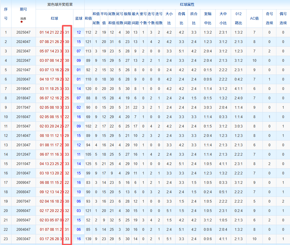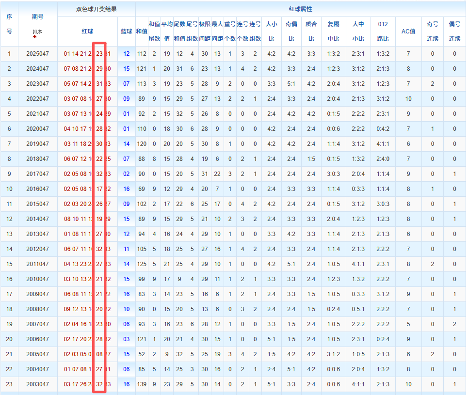 通过观察,我发现双色球往年同期的开奖数据与本期号码之间存在显著关联。具体来说,在红球中,从第一位至第六位,通常会有约4个位置上的数字与往年同期相同位置的号码一致;而蓝球号码中,也有多期开奖结果直接包含了往年同期的数字。因此,我们可以借助往年同期各位置上的号码,作为分析本期开奖情况的重要依据。在此基础上,还可结合往年同期的其他相关条件,进行综合性的号码组合推荐。