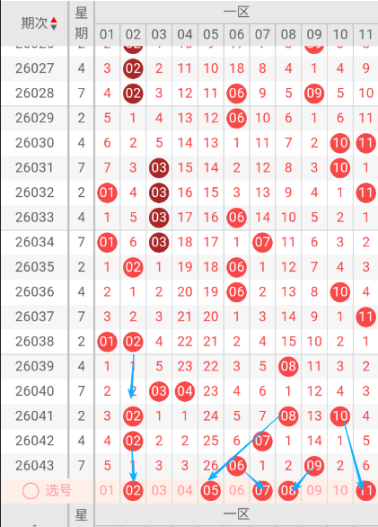 根据走势图可以看出当区段,030期开出10.11二个号码球 ,031期开出03.10个号码球 ,033期开出03.06二个号码球 ,034期开出01.03.07三个号码球 ,036期开出06.10二个号码球 ,037期开出11一个号码球 ,038期开出01.02二个号码球 ,041期开出02.08.10三个号码球 ,042期开出02.07二个号码球 ,043期开出06.09二个号码球 ,按照如此规律本期当前区判断可能会开出1单1双。我们看下当前区上期没有开出重叠号,那么本期当前区要定重叠号的情况下可关注09号码球。再看下当前区段上期开出06斜连号,当期选号得留意08斜连号。建议重点关注0205.07.08.11
